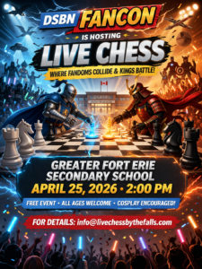 Exciting Live Chess action returns to Niagara with a game at Greater Fort Erie Secondary School in Fort Erie, Ontario. More details at www.livechessbythefalls.com